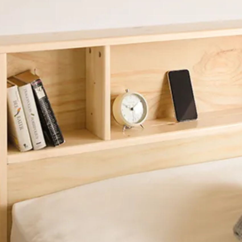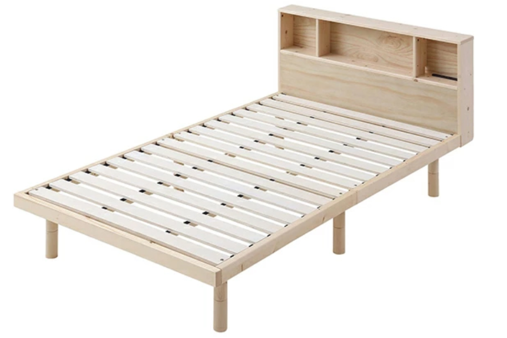 天然パイン材使用のすのこベッド。収納棚やUSB・コンセント付きヘッドボード◎脚は着脱可能で高さ調整もでき、通気性も抜群です。