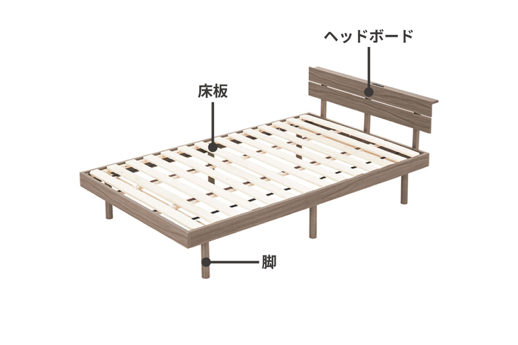 基本的にはベッドフレームの上にマットレスを乗せて使用します。ベッドを選ぶ時に、重要なのが「サイズ」「ベッドフレーム」「ヘッドボード」「床板」です。