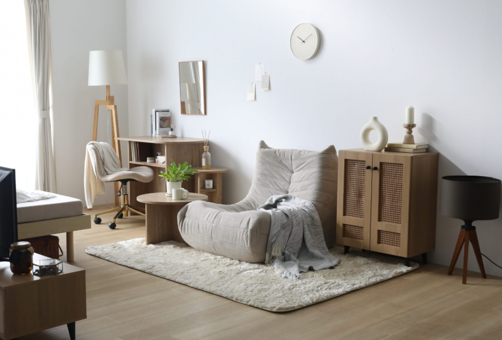 ローソファや低めの家具を中心に配置することで視線が抜け、ワンルームでも圧迫感のない仕上がりに。