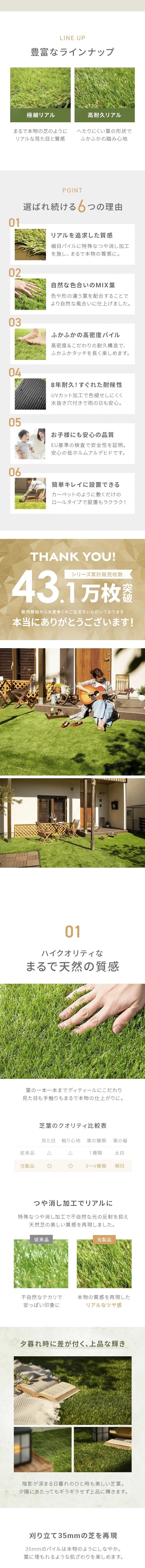 リアル人工芝 極細タイプ 芝丈35mm 1×1m(自然な見た目を追求・U字ピン付属)