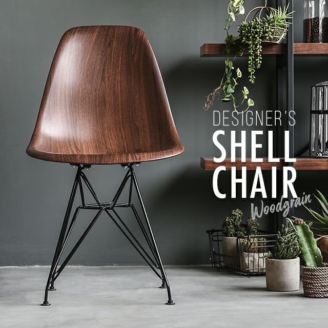 木の風合いを纏うシェルチェア ミッドセンチュリーモダンの代名詞「シェルチェア」に木目調タイプが登場。芸術的なフォルムはそのままに、繊細な木目が美しく映え、ナチュラルながらチェアの個性を存分に味わえる仕上がりとなっています。