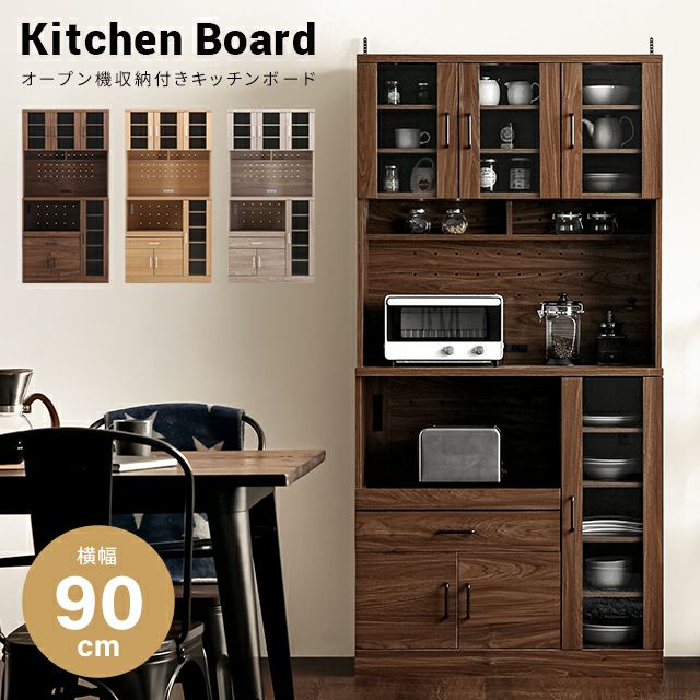 たっぷり収まるキッチンボード 日常使いの食器類からキッチン家電まで、スッキリと収納できるキッチンボード。ワイドな収納力で理想の空間づくりに役立ちます。 横幅 奥行き 高さ 約90㎝ 約41㎝ 約182㎝