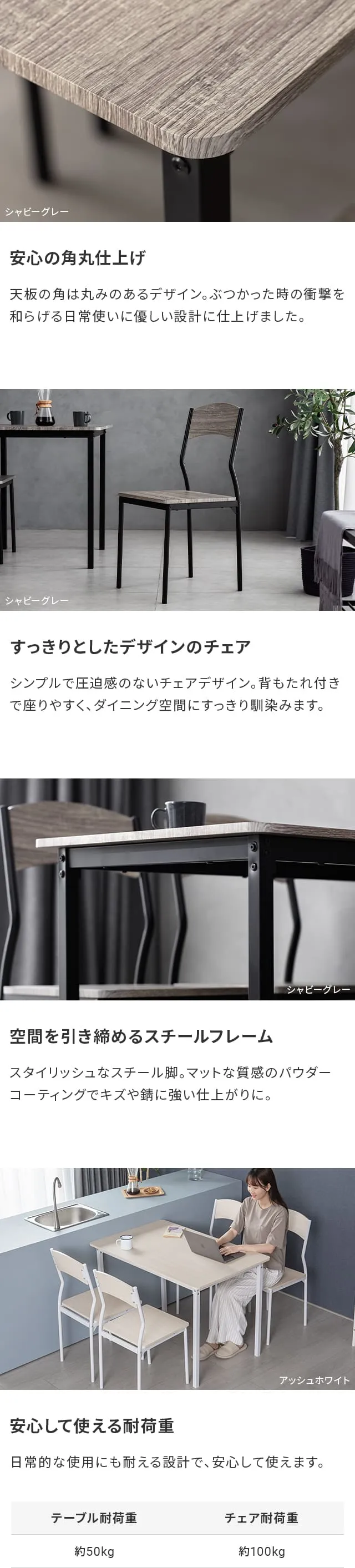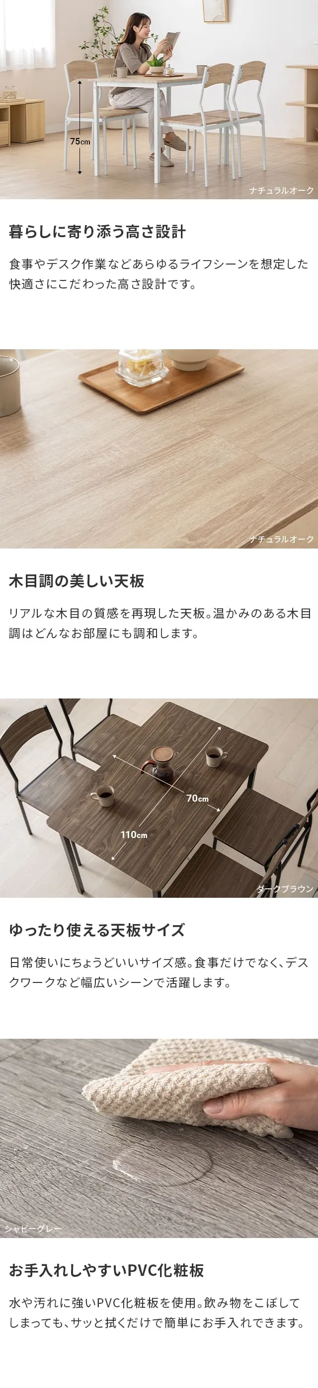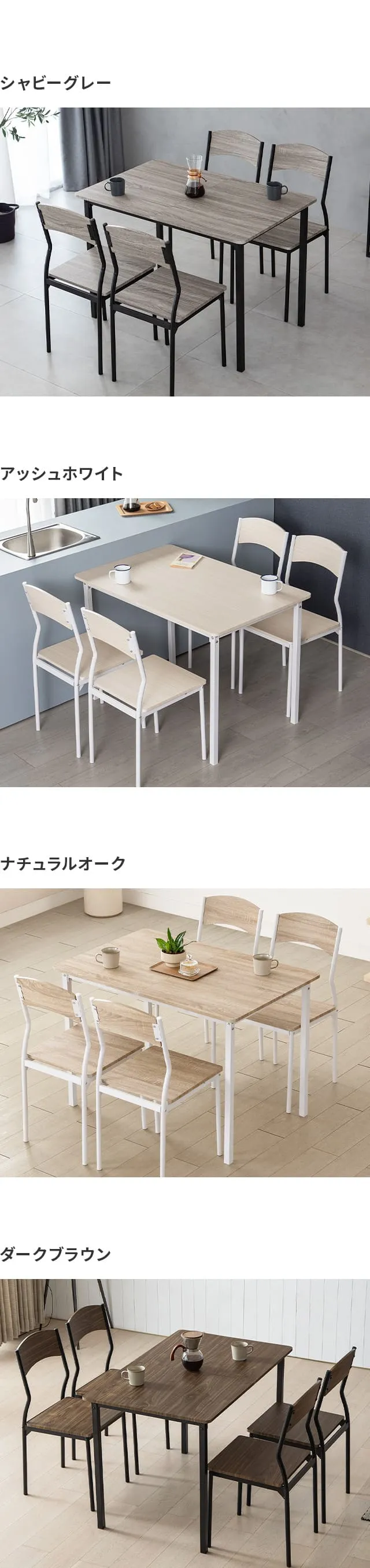 シャビーグレー、アッシュホワイト、ナチュラルオーク、ダークブラウン
