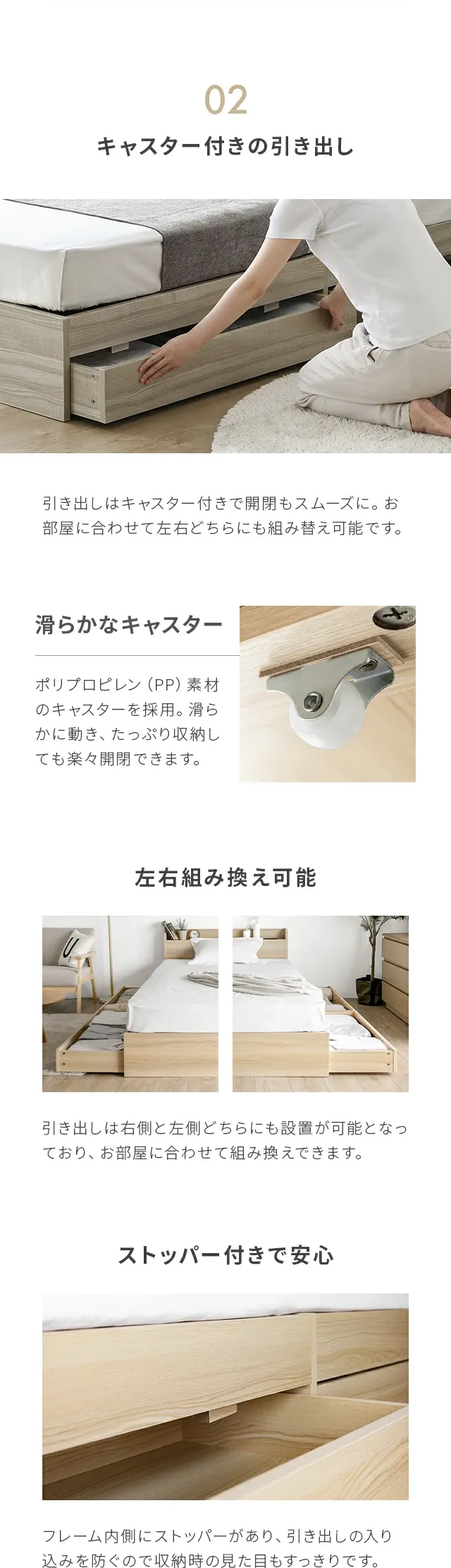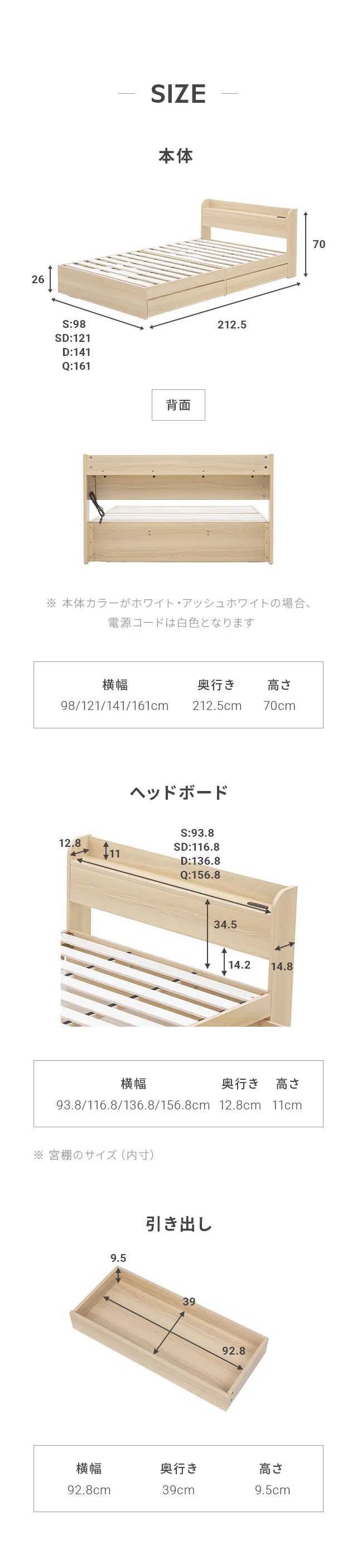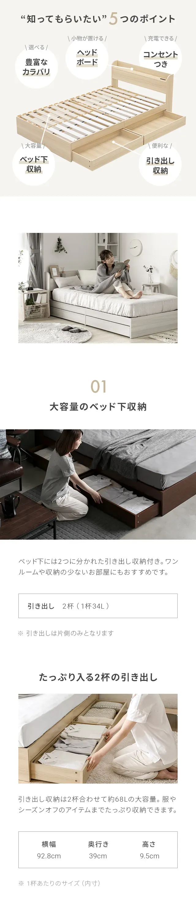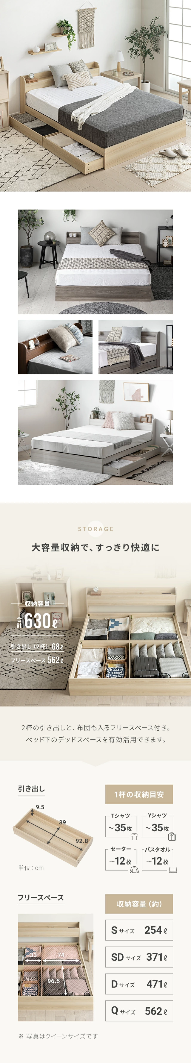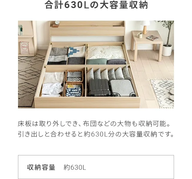 クイーンサイズを購入。 引き出しもついており、季節ものの布団も入れられて収納機能も充実しており満足。 欲しいカラーが在庫切れとなっており届くのが遅くなるとのことだったが、予定通りの日程で早めに届いてくれて助かった。