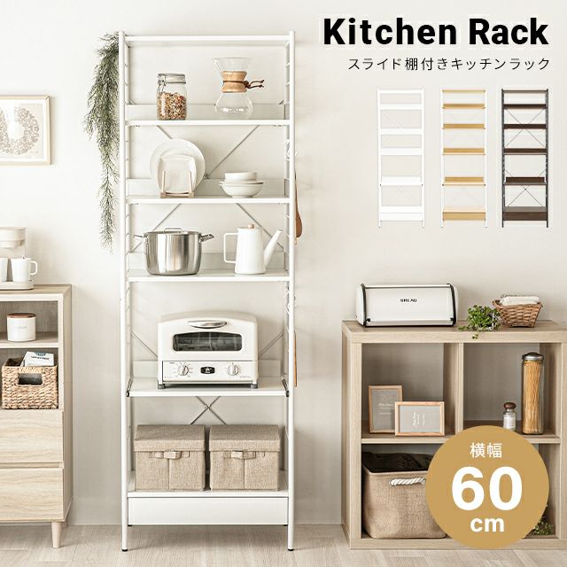 フタ付き家電の収納にぴったり手前に引き出せるスライドトレーは、蓋を開閉する炊飯器や蒸気が出るケトルの置き場所にぴったりです。 スライドなし スライドあり 蒸気が当たる棚板の痛みの原因になる 蒸気が当たらない熱を逃がして痛みを防止