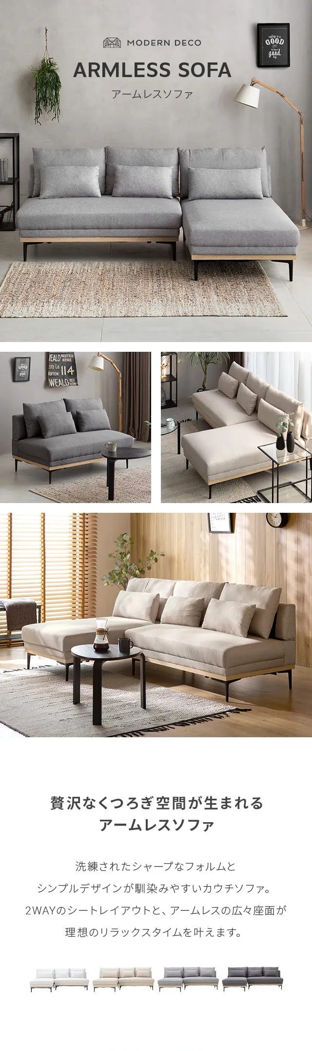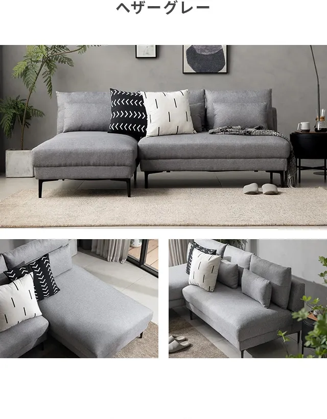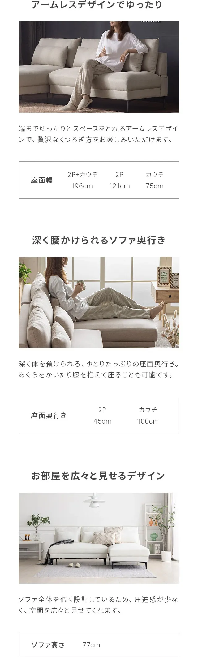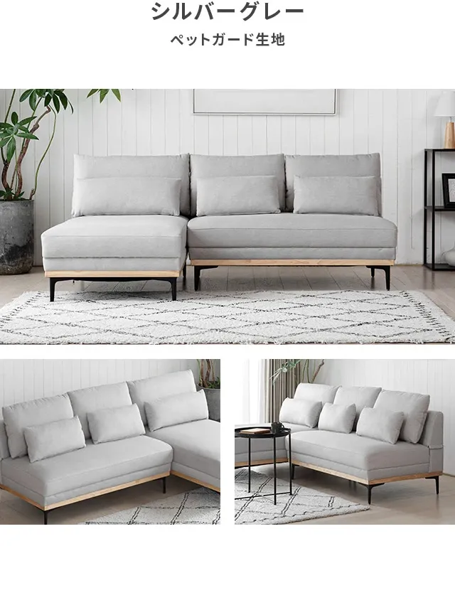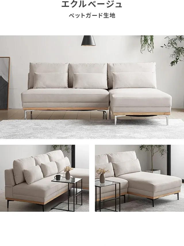 [幅196cm・アームレス広々] 3人掛け ワイドカウチソファ L字 肘なし