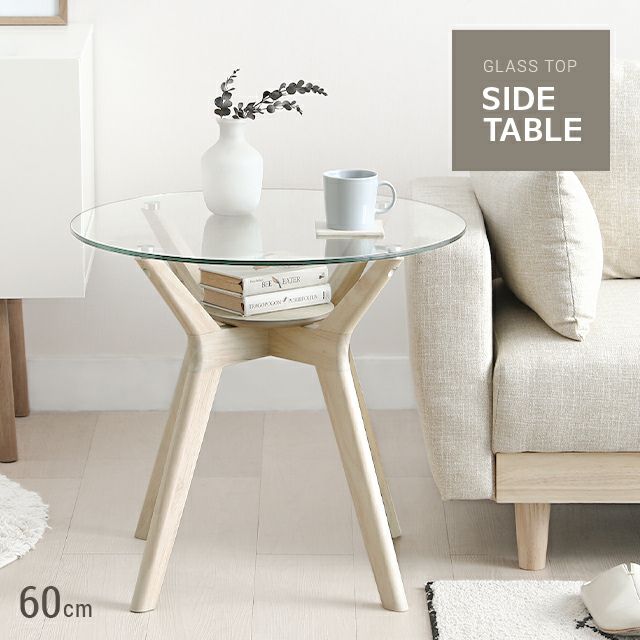 透け感がつくりだす爽やかな雰囲気 透明なガラスが爽やかさを演出する北欧風のサイドテーブル。光を通す開放感あふれるガラス天板と、明るい色味の天然木が重くならないスッキリとした空間作りに最適です。 <前へ 次へ>