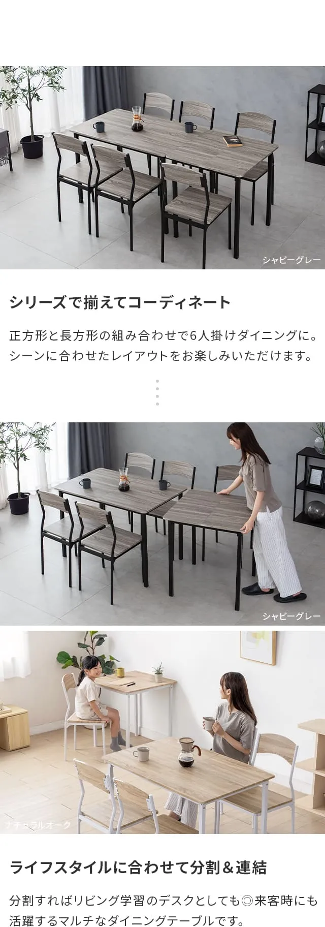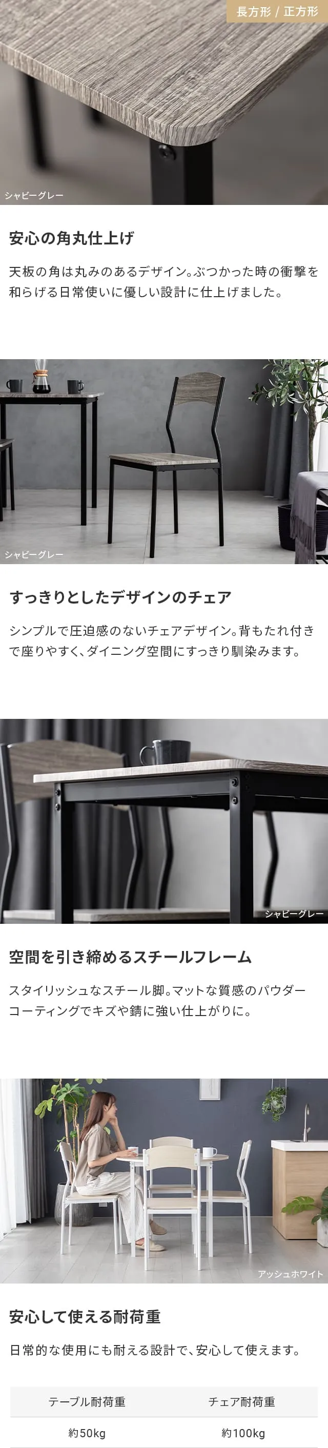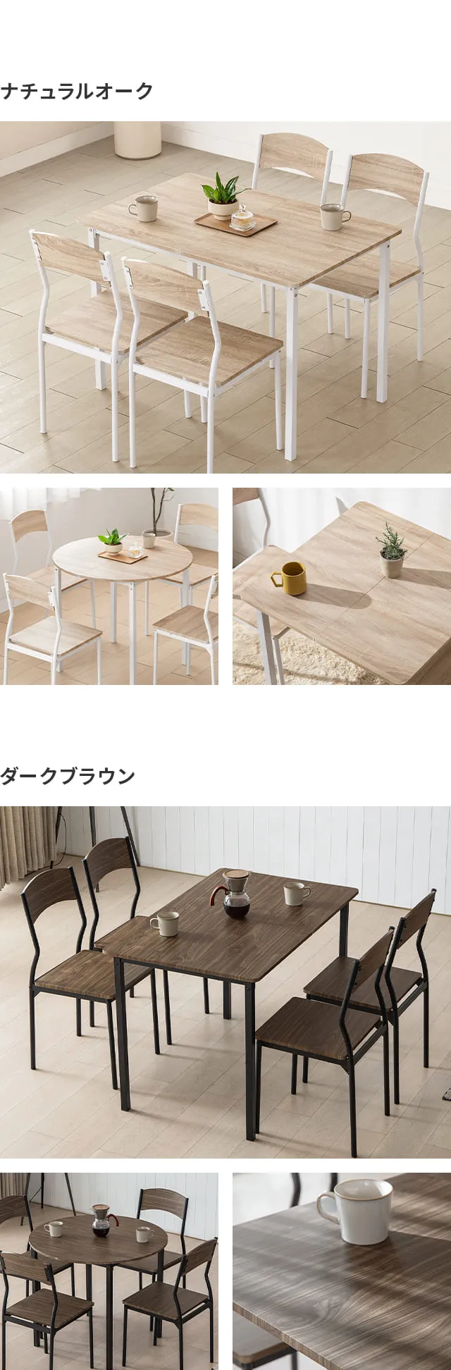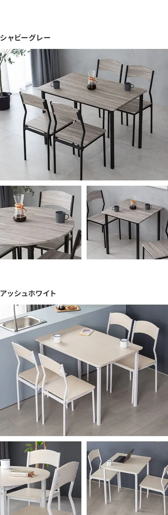 シャビーグレー、アッシュホワイト、ナチュラルオーク、ダークブラウン