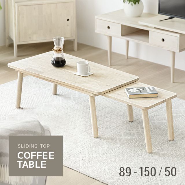 無垢材のぬくもりあるスライドテーブル ラバーウッド無垢材の優しい風合いを纏ったスライド式センターテーブル。どんなお部屋にも馴染みやすいナチュラルな雰囲気とスライド式の天板はシーンに合わせて長さを変えられるので長く愛されるデザインです。 <前へ 次へ>