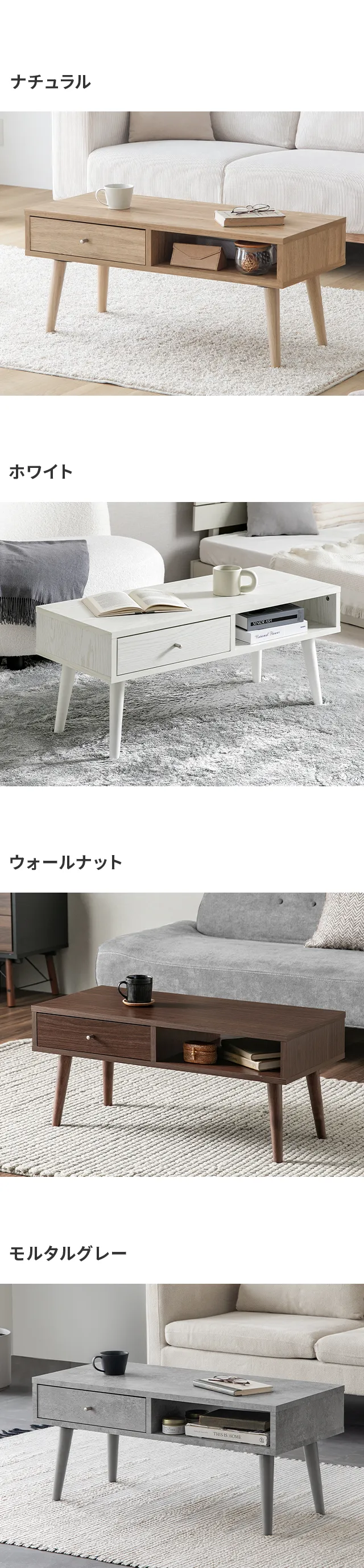 ホワイト、ナチュラル、ウォールナット、モルタルグレー